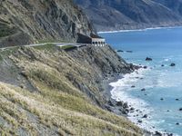 Driving along the Pacific Coast Highway in California, USA, the clear blue sky frames the stunning view of the coastal terrain, a combination of cliffs, promontories, headlands, and mountain peaks overlooking the ocean and sea below.