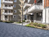 A cityscape of modern architecture and urban design in Berlin, Germany, with vegetation, buildings, and a clear sky. The residential area features a variety of elements such as brickwork, grass, a high-rise condominium, a road surface with asphalt, biomes, a bicycle with a wheel and tire, trees, pavers, a cloud, composite materials, a facade, a real estate property, and fixtures. The sunlight illuminates the city life and infrastructure, with a straight line down the road.