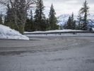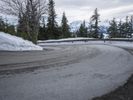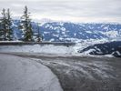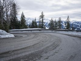 A winding road curves its way through the frozen landscape of the German Alps, leading travellers beneath a grey sky and towering snow capped mountains. Nature's geology is on full display, with a rock wall, mountain landforms, and icy terrain all visible in the distance.