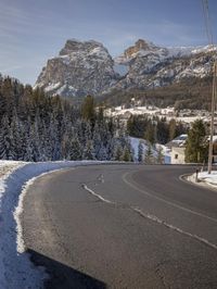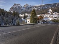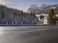 A view of the winding road through the German alps, surrounded by snow-capped mountain ranges, lush trees, and the residential homes of the highland. The sun is just visible on the horizon, making for a beautiful winter landscape.