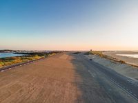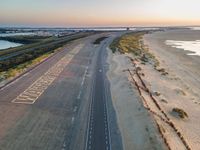 Aerial view of a straight road going down the coastline of Holland, surrounded by a concrete plain, asphalt, beach, vegetation, lake, and trees. Wood, metal, tints and shades, and composite material come together with signage, pattern, and fonts to create a memorable landmark.