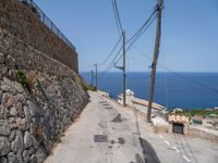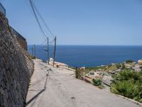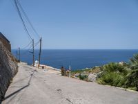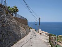 A long stretch of asphalt road winds its way through Mallorca, an island in the Balearic Islands of Spain. The coastal landscape is filled with bright blue water, with a clear sky overhead, making for a stunning day out in nature.