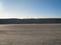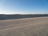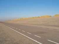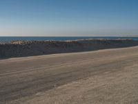 An asphalt road along the coastal shore of Holland is surrounded by a desert landscape of sand dunes, grass, and vegetation. The sun is shining down on the azure ocean, creating a beautiful contrast of tints and shades. Kitesurfers take advantage of the clear sky and strong winds, soaring in the air and above the Aeolian landforms.