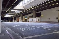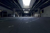 Black and white cityscape of Los Angeles, USA, at midnight. High-rise buildings, corporate headquarters, warehouses, and public spaces tower over the highway, parking lot, and other infrastructure. Rugged cement, asphalt, and concrete surfaces line the thoroughfare.