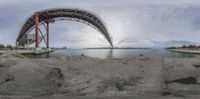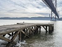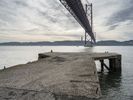 The pier of a lake in Europe, near Lisbon, Portugal, at break of day. The horizon is filled with a mix of nature and man-made structures including a bridge, underpass, asphalt and concrete surfaces, and a wooden pier.