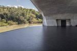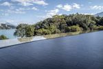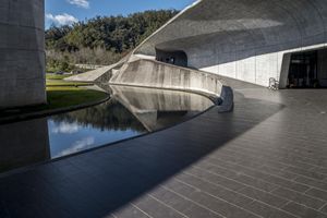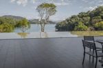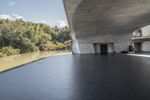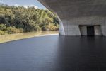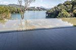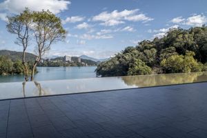 Scenic view of a coastal road in Taiwan, surrounded by lush vegetation and clear sky, with a reflection of the road surface on the water.