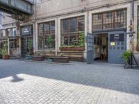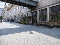 The urban design of Berlin, Germany is evident in this mixed-use neighborhood. Cobblestone roads lead the way to a variety of buildings, cafes, and public spaces, fostering a vibrant city life. The shadows of the day stretch down the roads, highlighting the unique architecture and real estate of the European city.