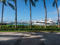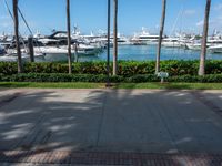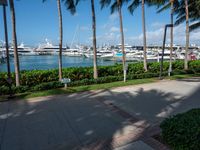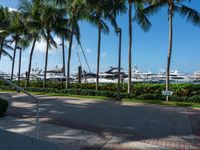 A top down view of the busy city streets of Miami Beach, Florida, USA. A pier, palm tree and jetty are seen with a concrete street and water in the background, giving a coastal urban feel with a hard shadow cast on the greenery and concrete.