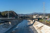 Aerial view of Los Angeles, USA, with amber and azure hues highlighting the city's infrastructure, including bridges, roads, buildings, and more, against the backdrop of a clear blue sky.