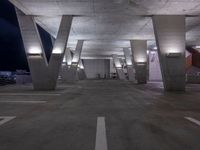 an empty parking space with lots of concrete pillars and lighting on the walls as seen from the ground