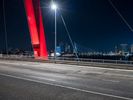 The city life of Holland is illuminated by the artificial light of its modern architecture, street lights, headlamps, and cable-stayed bridges. Water and shadows provide contrast to the straight through roads, asphalt surfaces, and electricity that power the urban design.