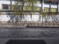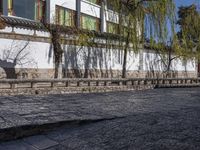 An alley-way in the ancient Chinese city of Lijiang, Yunnan, China, with a mix of classic architecture, cobble stone floors, tree-lined streets, and a bridge over a canal. Adapting to the natural environment, this city is a showcase of Chinese and Japanese architecture and history.
