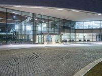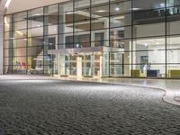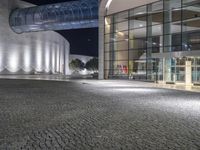 A modern building with a composite material facade and mechanical fan fixtures in Lisbon, Portugal, illuminated by artificial light and casting long hard shadows on the cobble stone road surface. A reminder of the vibrant city life and urban design of this metropolitan area in Europe.
