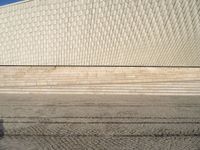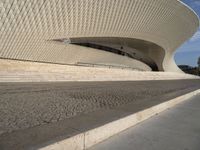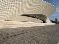 A clear sky day in Lisbon, Portugal reveals a modern urban design featuring a composite material facade, patterned road surface, asphalt and cobblestone, and a bicycle wheel fixture. Trees, a landmark tower, a wood art fixture, and a tar roof top design provide tints and shades to the city's skyline.