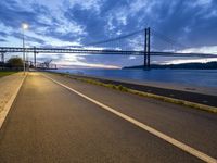 The city of Lisbon, Portugal is bathed in early morning sunlight as an asphalt road stretches from the coastal horizon. The tree-lined street is dotted with street lights and an underpass, while the landscape includes the bridge, lake, and ocean, set against the azure sky. The natural beauty of the area is complimented by the infrastructure and architecture, creating a unique atmosphere of electricity and water resources.