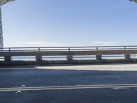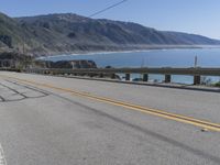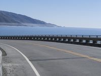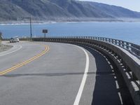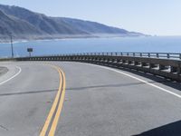 An asphalt highway curves around the shore of the Pacific Ocean in California, USA, with a metal guard rail and a concrete bridge as part of its infrastructure. The clear sky and the low coastal water line provide a beautiful backdrop to this fixed link of the Pacific Coast Highway and the Big Sur.