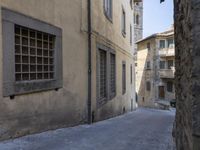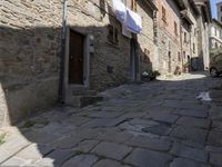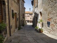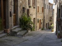 A classic architecture of a European city in Tuscany, Italy is showcased in this picture. The cobblestone lane is framed by stone walls and a mix of buildings, homes, and nonbuilding structures, with an open space including a garden and walkway. In the distance, a restaurant and other estate properties can be seen, with a hard shadow of a tree in the foreground. This is the perfect picture of a vacation or residential area for any urban traveler.