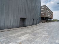 A black-and-white scene of a cityscape in the Netherlands, featuring a tire on the concrete road surface, a hotel, a restaurant, a residential area, a bridge, a tree, and a skyscraper in the background.