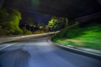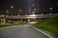 A one quarter perspective of asphalt road in Los Angeles, USA, illuminated by artificial light and street lights. Captured at night, the motion blur gives a sense of urban dynamism and life in the city.