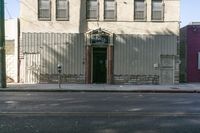 A view of a residential building in a suburban neighborhood in Los Angeles, California, USA. The classic architecture, brick fence, and iron door add to the charm of this urban design. The clear sky and asphalt road create a perfect backdrop for the city life and business district in the background.