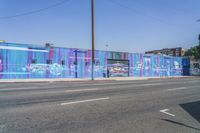 A view of a residential area in Los Angeles, California, USA during the day. The vibrant blue facade of the buildings and the colorful graffiti and murals on the walls add an artistic touch to the urban neighborhood. The road lined with trees creates a serene atmosphere under the clear purple and pink sky.