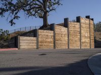 A stunning architectural masterpiece in Los Angeles, California, USA. This beautiful house with its wood walls and stone fence stands out against the clear blue sky. The road surface and gravel pathway lead to the property, surrounded by lush vegetation and towering trees.