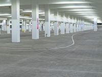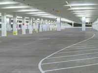 A parking deck in Los Angeles, USA, is illuminated by artificial light at night. The low angle view reveals the concrete surface and the straight road leading to the parking garage or lot.