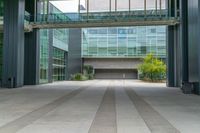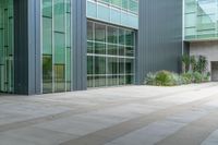 A one quarter profile shot of a modern office building in the bustling business district of Los Angeles, California, USA. The concrete surface stretches out in an open space down the straight road.