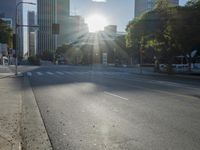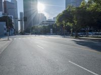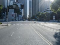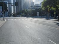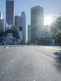 A panoramic view of the cityscape of Los Angeles, California, USA, with its modern high-rise architecture, vast roads, vehicles, and trees, illuminated by the bright morning sunshine.