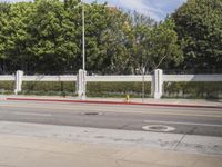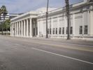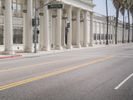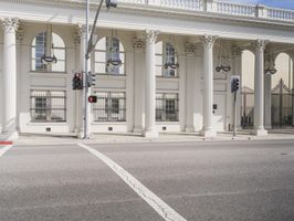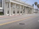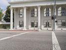 A classic architecture building with yellow facade in a residential area of Los Angeles, California, USA. The public space includes a road surface with curb, lane, Armco barrier, and woody trees. Infrastructure, transport, and real estate are also visible in this urban neighborhood.