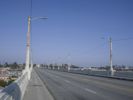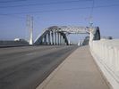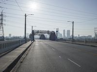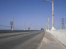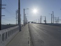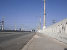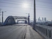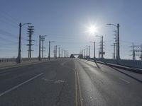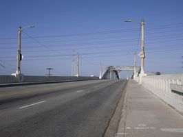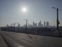 A view of Los Angeles, California, USA, showing a low bridge, an asphalt road, and skyscrapers in the background. The urban infrastructure of the metropolitan area is illuminated by the first sunlight of the day, providing a glimpse of the cityscape, skyline, and controlled access highway below.