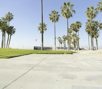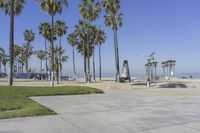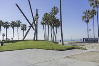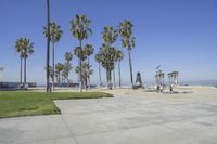 A sunny day in Los Angeles, California, USA, featuring a wide-open beach landscape with vegetation, a palm tree, a walkway, a sea shore, a plaza, a stadium, a concrete surface, an asphalt road, a land lot, a street light, a graffiti wall, and a public space. A perfect spot for a vacation or recreational activity.