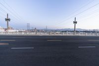 Los Angeles, California, USA is a bustling metropolitan area known for its urban skyline, extensive infrastructure, coastal atmosphere, and public spaces. This panoramic shot features a dawn view of the city, with the bridge, Armco barrier, road surface, buildings, residential area, and overhead power lines all visible. Automobiles, boats, and ferries are seen in the scene, along with structures such as towers, the skyline, and the sea in the horizon. The clear sky and wind make for a peaceful atmosphere in the evening, as electricity is transmitted through a transmission tower in the background.
