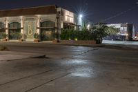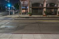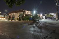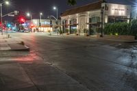 A mixed-use residential area of Los Angeles, USA, during the late night. The classic architecture of the buildings are illuminated by artificial light, with a pedestrian crossing, stoplight, and street light at the forefront. Vehicles, concrete, asphalt, and vegetation are all part of the urban infrastructure.