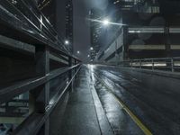 A view of Los Angeles, California, USA at night, with the modern architecture of its metropolitan area illuminated by artificial street lights, and a highway entrance or exit in the foreground, illuminated by the wet atmosphere of this urban metropolis.