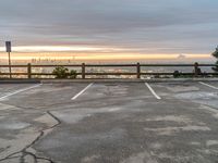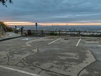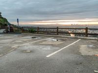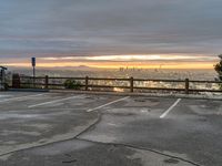 An emotional overview of the metropolitan area of Los Angeles, California, USA on a grey sky day. The light from the sun shines on the asphalt surface and parking lot, with a view of the skyline, horizon, open space, and water below. Trees and a fence provide a rural atmosphere for a tourist to overlook.