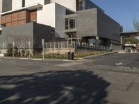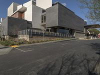 A view of the city of Los Angeles, California, USA, featuring modern architecture, residential buildings, and a mixed-use business district. The clear sky illuminates the asphalt road, curbs, and parking lots, providing a glimpse into the city's infrastructure, public spaces, and suburban neighborhoods.