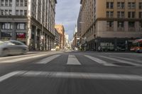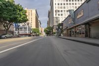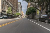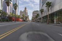 A view of the urban design and architecture in downtown Los Angeles, California, USA, with a straight road and motion blur, capturing the bustling city life.