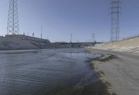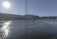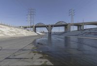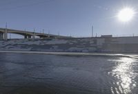 A view of the Extra Dosed concrete bridge in Los Angeles, California, USA. The bridge stretches across the water from the shore line, and is a connecting structure for suburban roads, providing access to coastal resources and energy. The wet surface is visible against the clear sky, with sunlight reflecting off the ice and road surface in the winter evening.