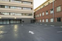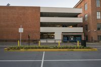 A modern high-rise condominium in the Los Angeles neighborhood of California, USA, with a brick facade, asphalt flooring, concrete curb, tree, and street light illuminated on a sunny day.