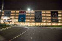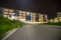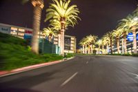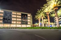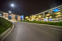 A one quarter perspective of the city of Los Angeles in the USA, illuminated by artificial light and featuring motion blur from cars driving down the road. The asphalt road and modern architecture illuminated by street lights create a sense of urban design at night.