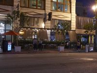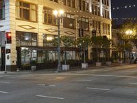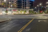 A view of the bustling nightlife of Los Angeles, California, USA. The classic architecture, artificial lights, and bustling roads give an insight into the metropolitan area's infrastructure. Automobiles, yellow street lights, and a parking lot are illuminated against the dark sky and trees that line the low profile of the human settlement.