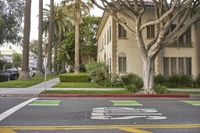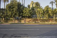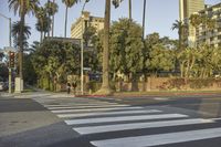 A quiet residential neighborhood in Los Angeles, California, USA, illuminated by the soft light of dawn. Rows of houses line the streets, shaded by lush trees and palm trees. The classic architecture and well-maintained infrastructure add charm to this suburban town.