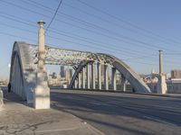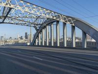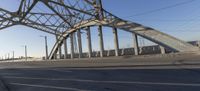 The early morning sky in Los Angeles, California, USA reveals a skyline full of urban infrastructure, including bridges, buildings, trees, and automobiles. From the asphalt road below, a cable-stayed bridge, an arch bridge, a tied-arch bridge, an extradosed bridge, and a concrete bridge are visible, all connected by a fixed link. Iron structures provide a contrasting backdrop to the cityscape.