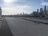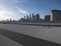 A breathtaking view of the Los Angeles skyline, showcasing the city's modern architecture and metropolitan area. The clear sky and sunny weather complement the high-rise buildings, skyscrapers, and condominiums. The urban design and open spaces offer a vibrant city life experience, with asphalt roads and parking decks providing convenience for residents and visitors alike.