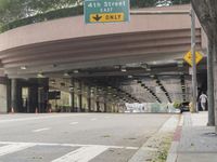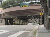 A modern urban architecture in Los Angeles, California, USA featuring a bridge and underpass over a busy city road.