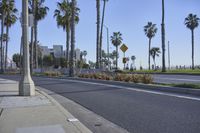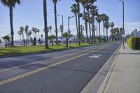 A straight road runs through a residential area of Los Angeles, California, USA. The coastal landscape is composed of sandy beaches, date palms, and a variety of vegetation. The clear sky is pierced with contrails, and the low infrastructure mode of transport is popular for recreational and mixed-use purposes.