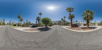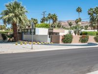 A residential villa in Palm Springs, California, USA, is seen against a clear sky, surrounded by classic mid-century suburban homes and asphalt roads, under the backdrop of the Sonora Desert and its iconic palm trees.