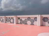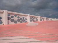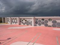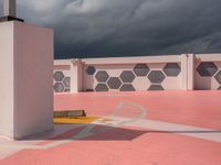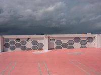 The urban design of Miami Beach, Florida, USA is laid out in this parking lot and open space with a grey sky over the asphalt on a gloomy day.