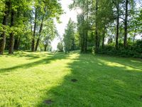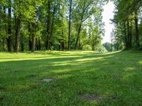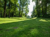 A beautiful landscape of a city park with lush green grass and trees, bathed in sunlight on a clear sunny day.